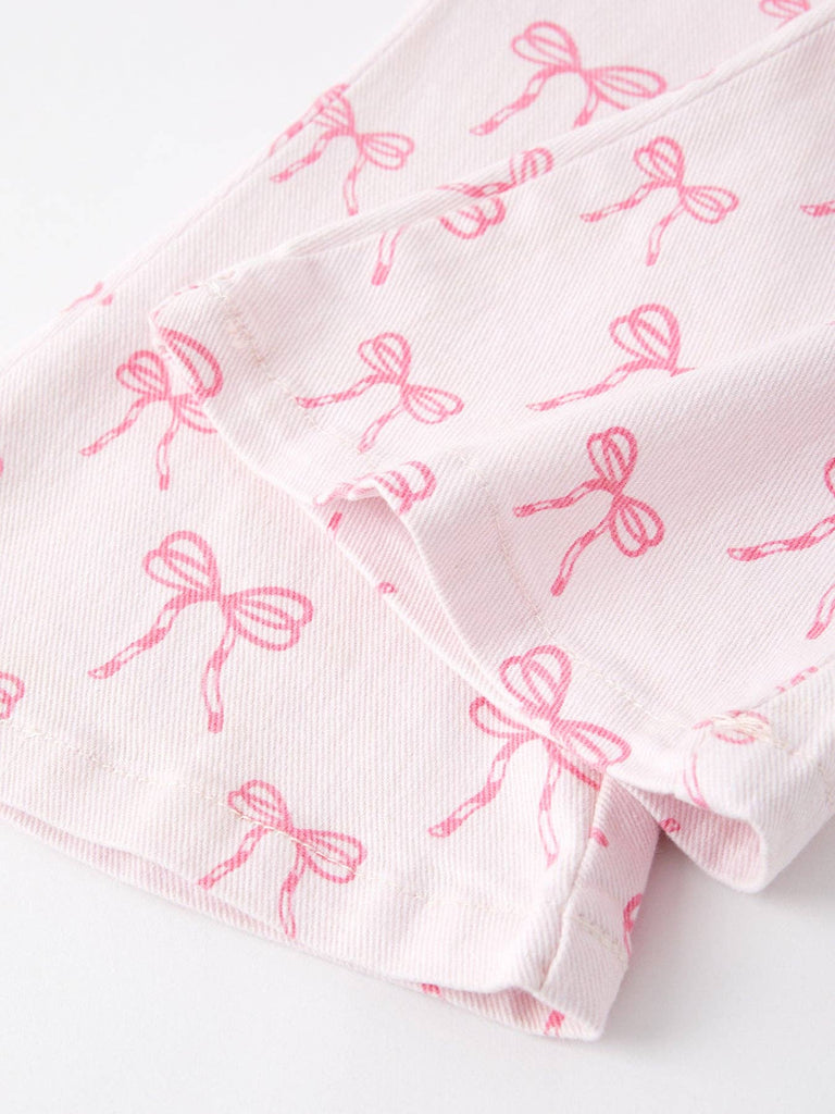 Get ready to add a touch of fun to your little girl's wardrobe with our Girls Pink Bow Print Elastic Jeans! These jeans feature a charming bow print and an elastic waistband for comfort and convenience. Perfect for any occasion, these jeans will keep your little one stylish and comfortable all day long. Order now and add a pop of color to your little fashionista's outfit!