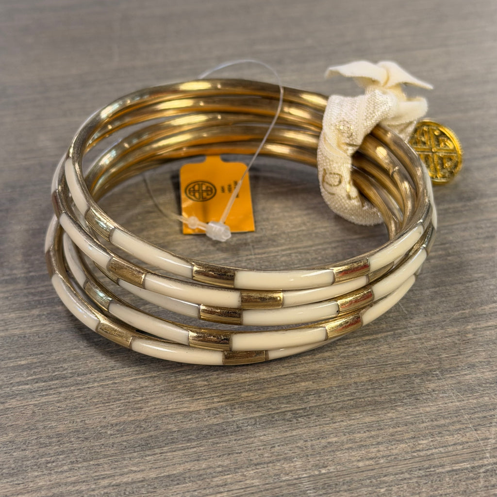 BuDhaGirl's Veda enamel and brass bangles have become a beloved choice for mixing and matching! Every wardrobe needs wonderful, classic ivory. Vedas are meticulously crafted bangles that feature exquisite enamel work in stunning colors, designed to complement our AWB® and enhance your wristscape. With their slim profile and feather-light feel, these six beautiful bangles are a joy to wear because they are so very combinable