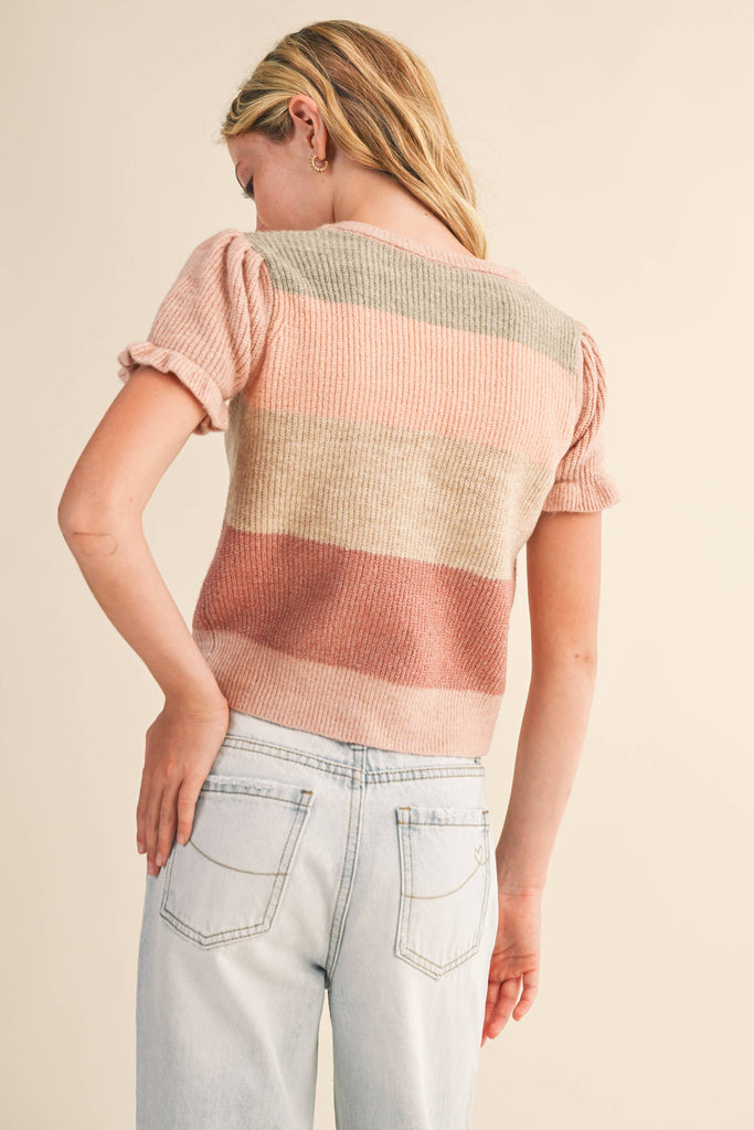 Add cozy charm and playful color to your girl's wardrobe with this soft knit sweater. Designed with wide horizontal stripes in muted pinks, sage green, and beige, this top offers a modern twist on a classic style. The short puff sleeves with subtle ruffle edges give it a sweet, feminine flair, while the ribbed knit adds comfort and texture. Perfect for layering or wearing on its own, this sweater transitions effortlessly from playdates to family outings.